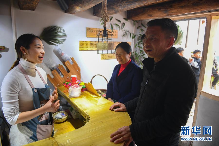2月1日,在湖南省汝城县沙洲瑶族村,村干部向村民(左)了解新开张的奶茶店铺的经营情况。新华社记者 陈泽国 摄