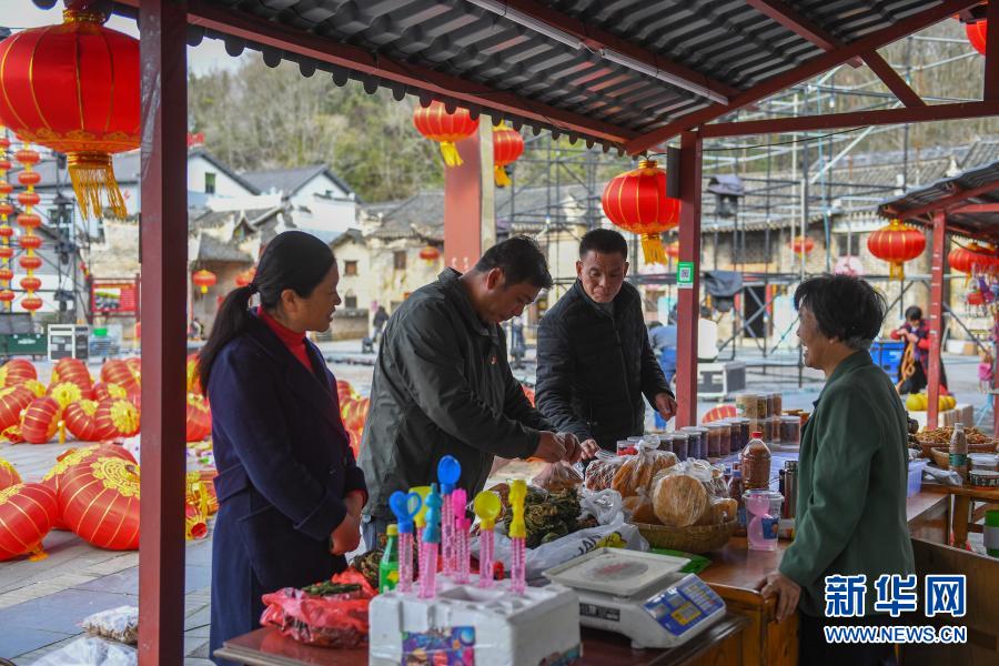 2月1日,在湖南省汝城县沙洲瑶族村,村干部向村民(右)了解摊位的销售情况。新华社记者 陈泽国 摄
