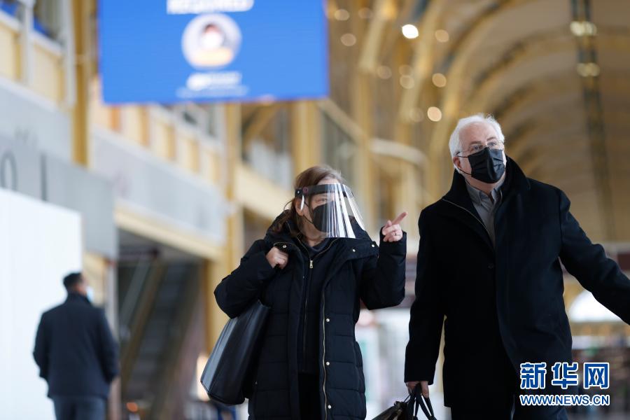 2月2日,在美国弗吉尼亚州阿灵顿的罗纳德·里根华盛顿国家机场,旅客戴着口罩走在航站楼内。新华社发(沈霆 摄)