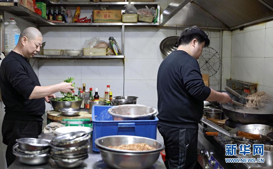 2月2日晚,刘丹的丈夫刘建成(左)在后厨帮助厨师备菜。新华社记者 姚剑锋 摄