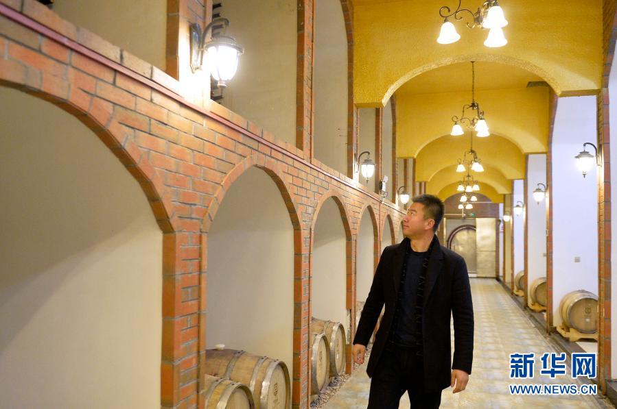 酿酒师李财在酒窖里检查储存的葡萄酒(1月6日摄)。新华社记者 唐如峰 摄