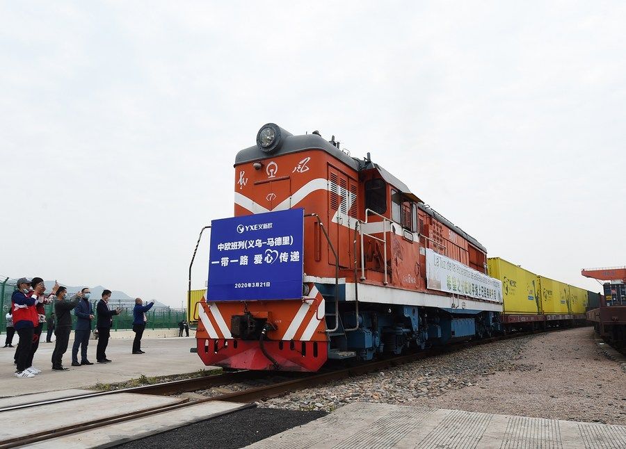 2020年3月21日,载着捐赠西班牙抗疫物资的“义新欧”中欧班列(义乌—马德里)从义乌铁路西站发车,前往马德里。 新华社发(龚献明 摄)
