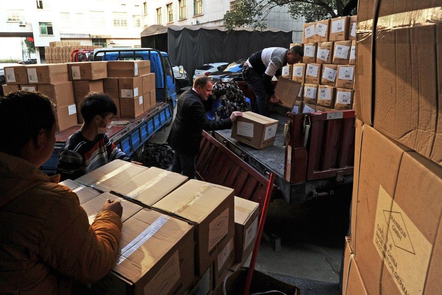 2019年11月28日,英国人奈杰尔(右二)在公司仓库查验一批出口货物。 2005年初,奈杰尔来到浙江省义乌市国际商贸城,为这里的经营户培训英语。2014年11月以来,中欧班列(义乌)相继开通了11条线路。自此,奈杰尔的进出口生意也有了新通道。新华社记者 谭进 摄