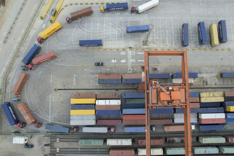 2016年12月28日,在浙江义乌火车西站,装有中国出口商品集装箱的货车排队进入一列中欧班列的装卸区。 新华社记者 黄宗治摄