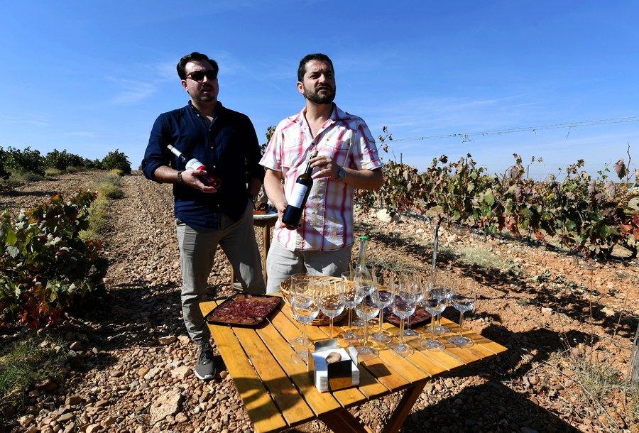 2017年9月24日,在西班牙葡萄酒产区巴亚多利德市的一处葡萄园内,两名村民在展示当地酿酒的葡萄。这里的葡萄酒有一部分会通过“义新欧”班列出口到中国。新华社发 (郭求达 摄)