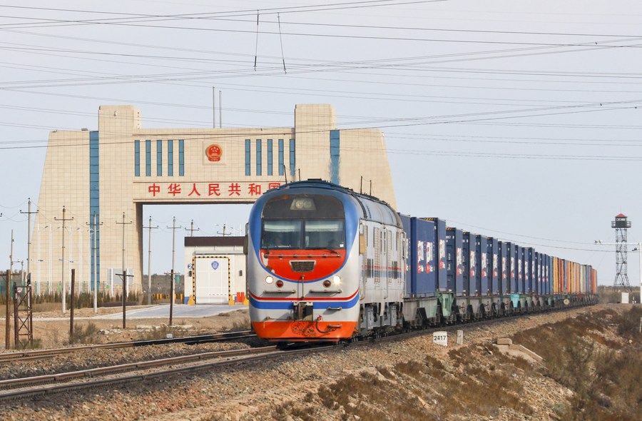 2017年4月24日,首趟中欧班列(伦敦-义乌)从中国阿拉山口口岸入境。新华社发(张永恒 摄)