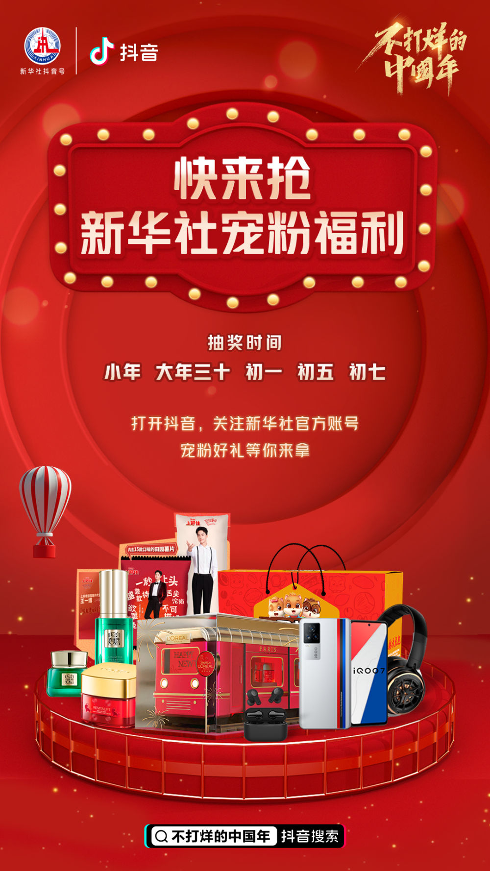 过年回家和亲人团聚、安安稳稳吃一顿团圆饭成了大多数人最深切的心愿。但受疫情影响,许多人选择就地过年,甚至坚守岗位。今年,新华社带着温暖宠粉礼物邀你一起过一个“不打烊的中国年”。快来关注抖音、快手平台的“新华社”账号,按照规则参与抽奖活动赢取大礼,从小年这一天开始,新一年好运收收收不停!