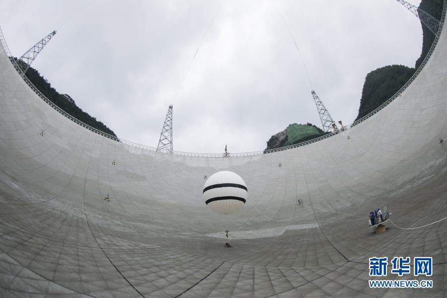2019年8月30日,工作人员在FAST反射面板上实验“微重力蜘蛛人”方案。新华社记者 欧东衢 摄
