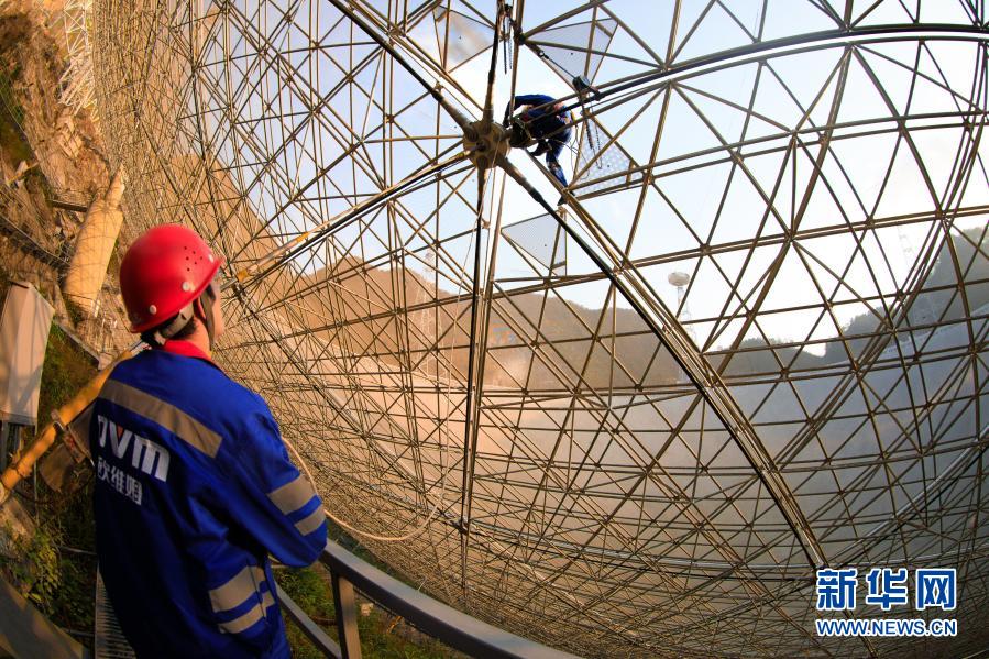 2020年1月9日,工作人员对FAST反射面板进行检修。新华社记者 刘续 摄