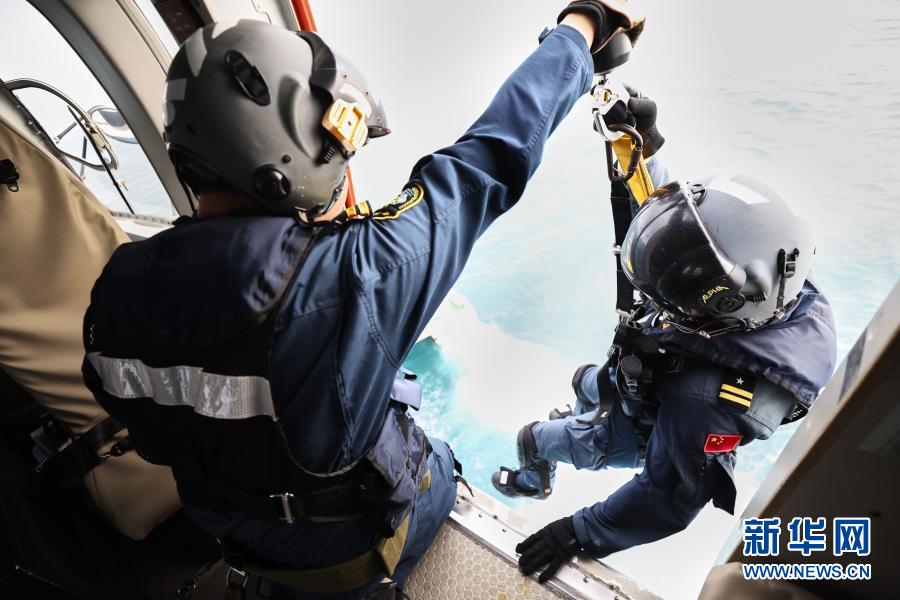 2月1日,在救助训练中,救生员杨建辉(右)出机舱。新华社记者 张丽芸 摄