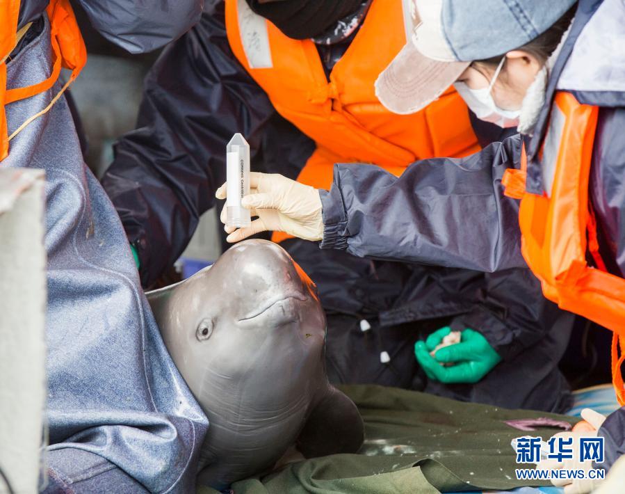 2017年3月16日,中科院水生生物研究所工作人员在鄱阳湖都昌水域对江豚进行体检。 新华社发(傅建斌 摄)