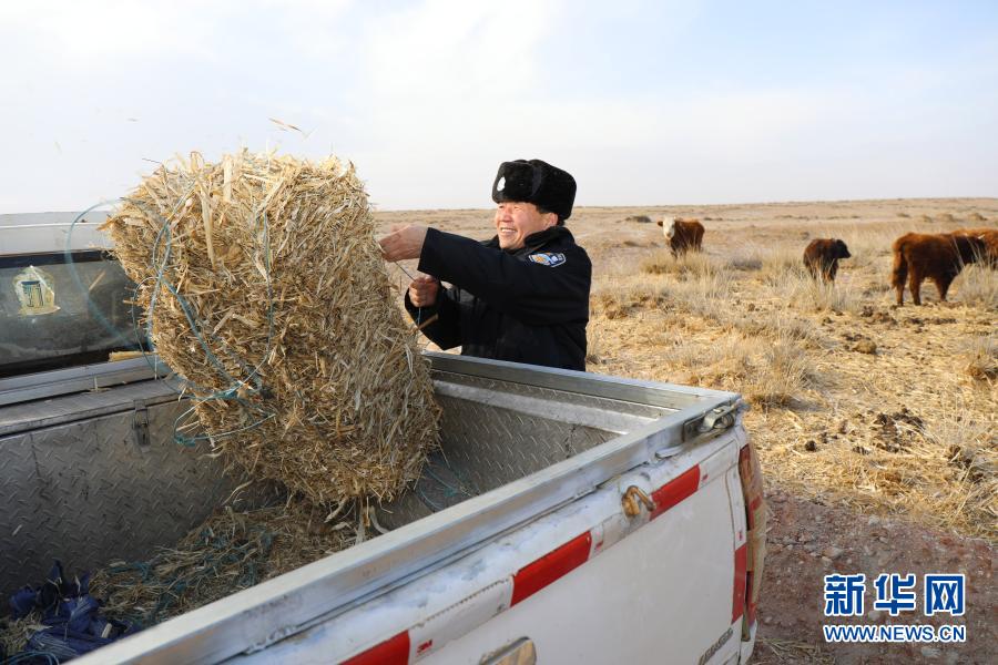 宝音德力格尔下乡入户时,帮助牧民搬运过冬草料(资料图片)。新华社发