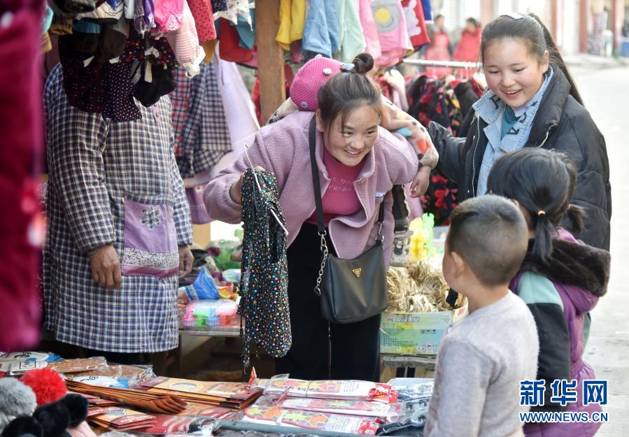 1月22日,巴木玉布木在当地集镇一家服装店给孩子挑选衣服。新华社记者 周科 摄