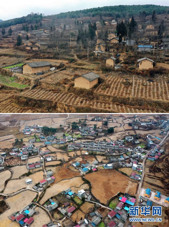 拼版照片:上图是巴木玉布木童年住过的村庄(1月21日摄);下图是她现在居住的桃园村(1月21日摄)。新华社记者 李思佳 摄