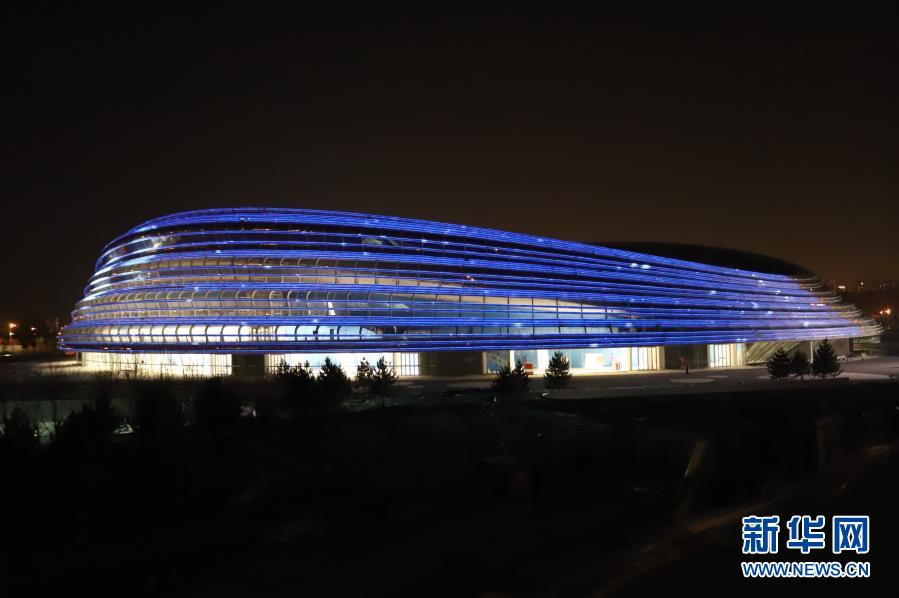 这是2020年12月15日拍摄的进行场馆外立面泛光照明调试的国家速滑馆“冰丝带”。新华社记者 张骁 摄