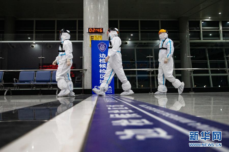 凌晨,慈会(左)和同事在机场执行边防检查任务(2月3日摄)。新华社记者 朱峥 摄