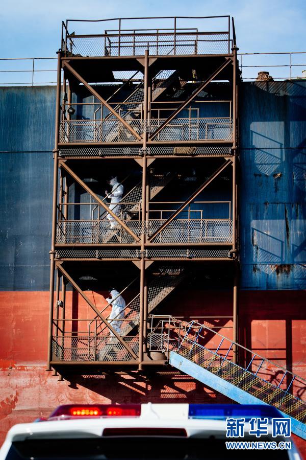 一艘来自澳大利亚的货轮停靠码头,许国利(上)和同事登船检查后走下货轮(2月4日摄)。新华社记者 朱峥 摄