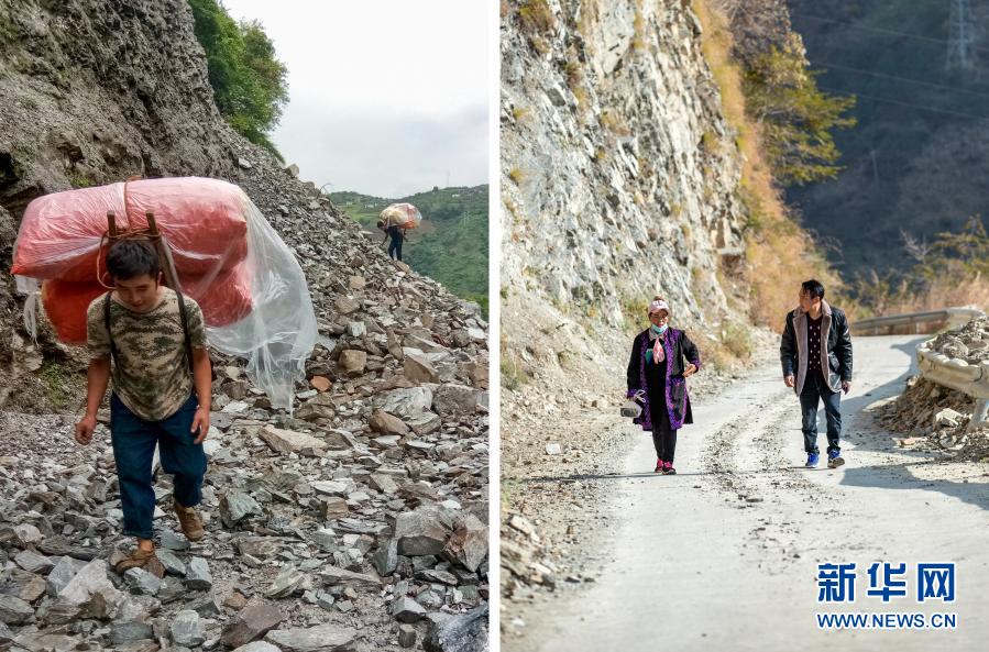 拼版照片:左图为2018年7月16日,村民走在硬化前的四川省凉山彝族自治州冕宁县里庄镇全阁村通村路上运输物资(新华社发 邹海荣 摄);右图为2021年1月13日,村民走在硬化后的全阁村通村路上(新华社记者 沈伯韩 摄)。新华社发
