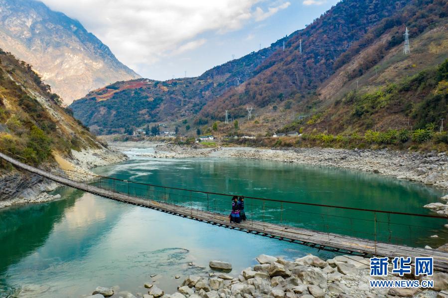 四川省凉山彝族自治州冕宁县里庄镇全阁村村民走在横跨雅砻江的铁索桥上(1月13日摄,无人机照片)。新华社记者 沈伯韩 摄