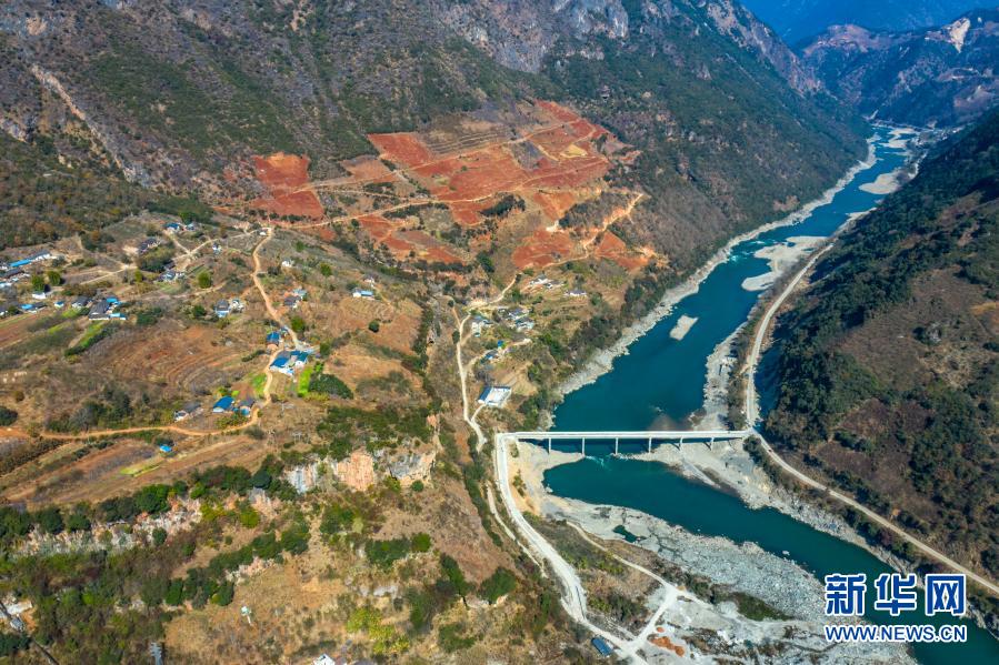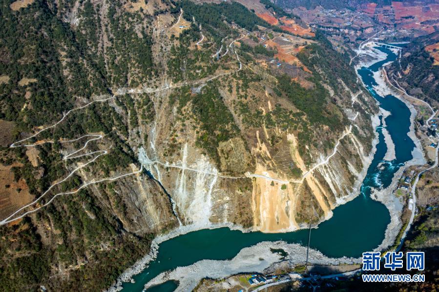 这是1月13日拍摄的坐落于雅砻江畔悬崖绝壁上的四川省凉山彝族自治州冕宁县里庄镇全阁村和通村路(无人机照片)。新华社记者 沈伯韩 摄