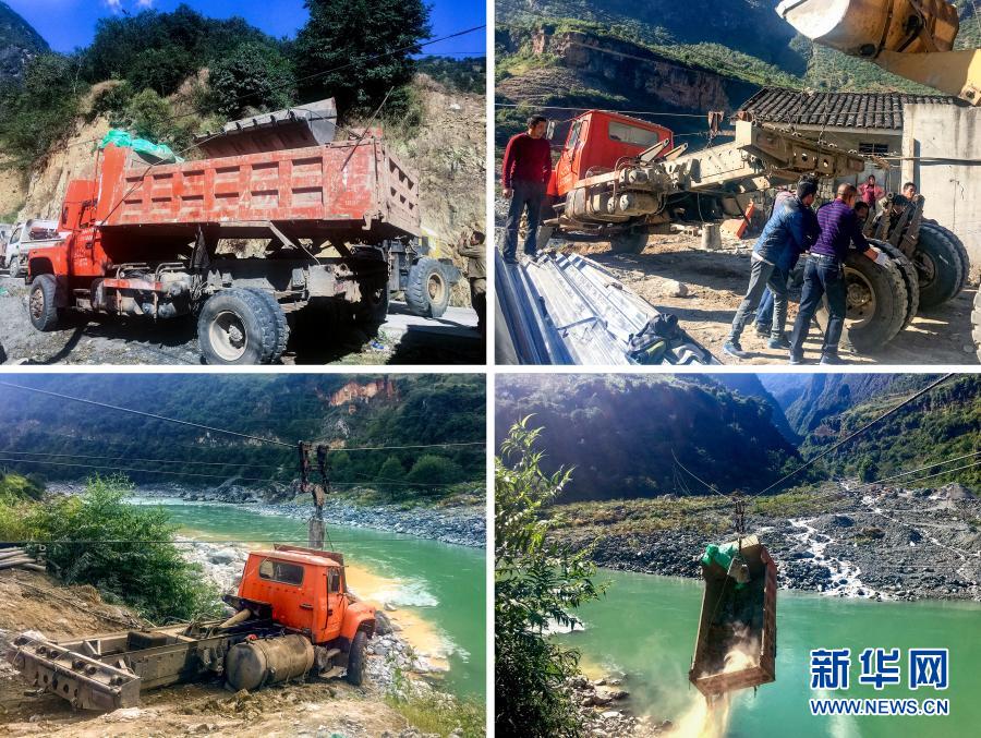 2017年11月5日,在四川省凉山彝族自治州冕宁县里庄镇全阁村硬化路面施工现场,人们先在雅砻江上架起一条溜索,把工程车大卸数块,一块块通过溜索运到江对岸。这是工程车被拆卸后运过雅砻江的过程(拼版照片)。新华社发(邹海荣 摄)