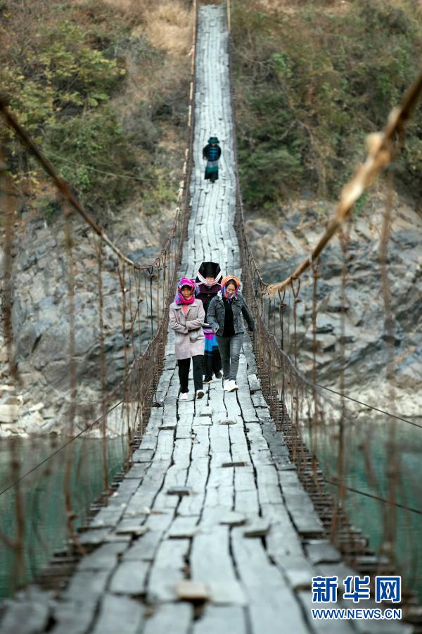 四川省凉山彝族自治州冕宁县里庄镇全阁村村民走在横跨雅砻江的铁索桥上(1月13日摄)。新华社记者 沈伯韩 摄