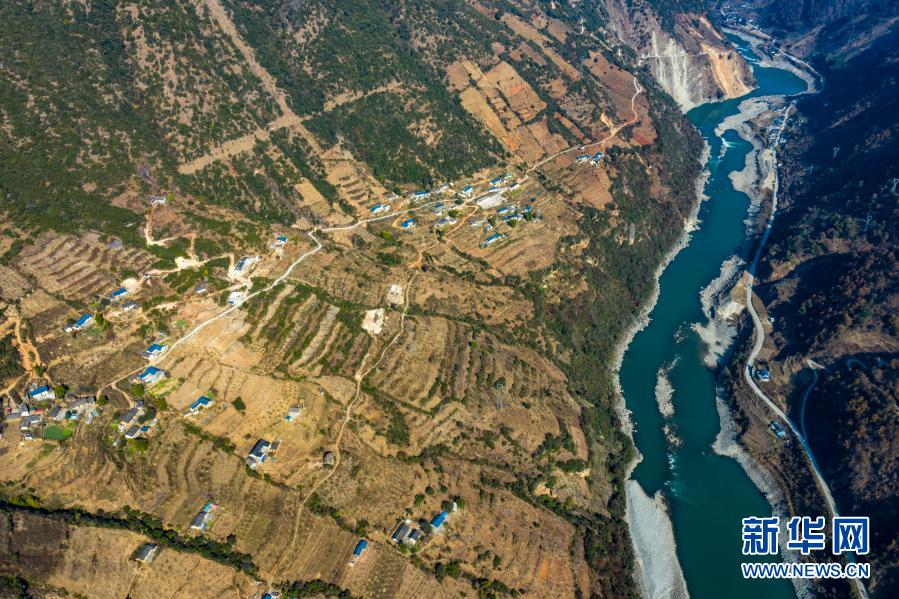 这是1月13日拍摄的坐落于雅砻江畔悬崖绝壁上的四川省凉山彝族自治州冕宁县里庄镇全阁村(无人机照片)。新华社记者 沈伯韩 摄