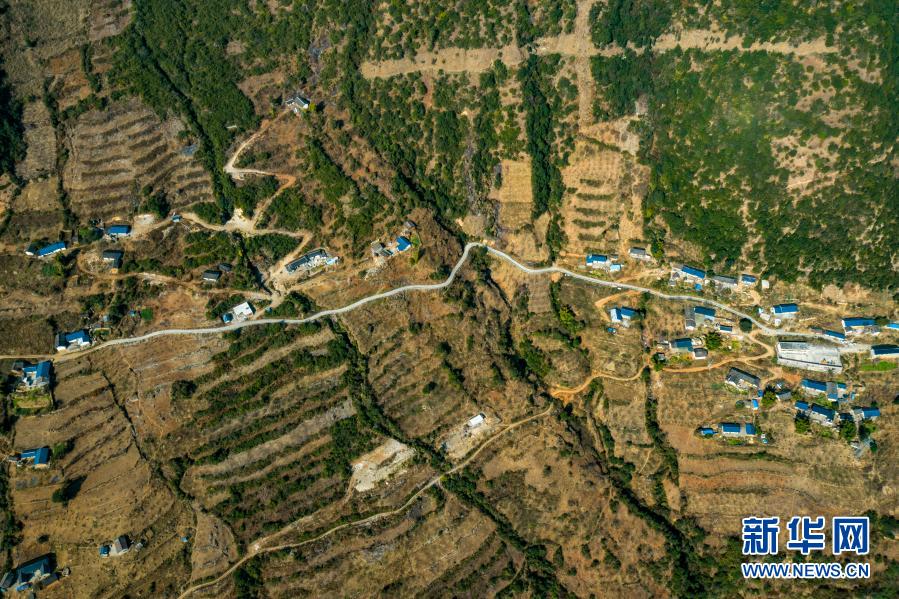 这是1月13日拍摄的坐落于雅砻江畔悬崖绝壁上的四川省凉山彝族自治州冕宁县里庄镇全阁村的通村路(无人机照片)。新华社记者 沈伯韩 摄