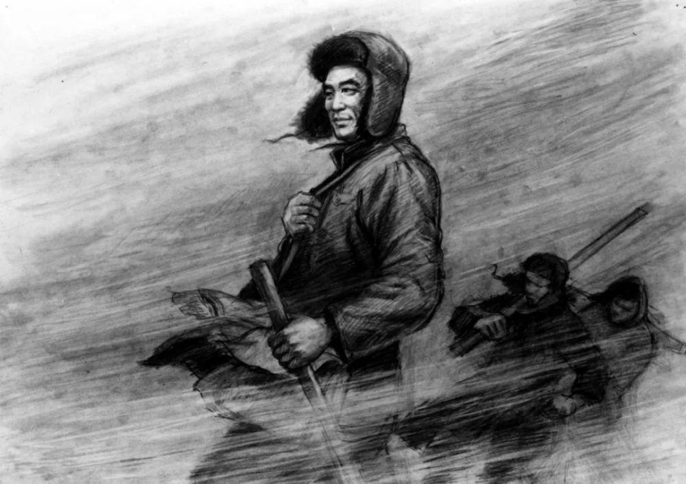 焦裕禄不顾自己患着严重肝病,和调查队的同志们一起投入全县范围的追洪水、查风口、探流沙的调查研究工作。新华社发(当年的漫画,徐天敏作)
