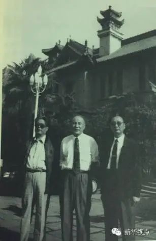 上世纪90年代,穆青(中)与冯健、周原在当年写稿的开封宾馆前合影。