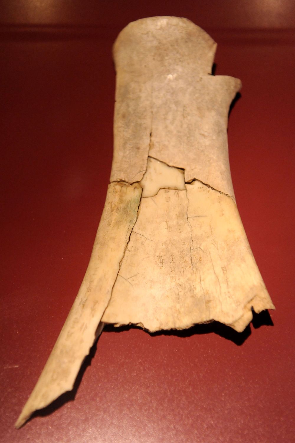 这是在安阳殷墟博物馆内拍摄的刻有卜辞的牛肩胛骨