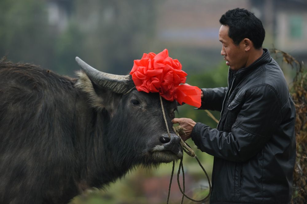 湖南郴州的农民给准备下田参加开耕仪式的耕牛头扎红花