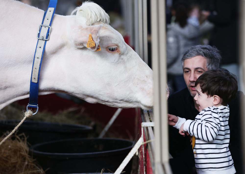 一名男子带着孩子在第57届法国国际农业博览会上参观