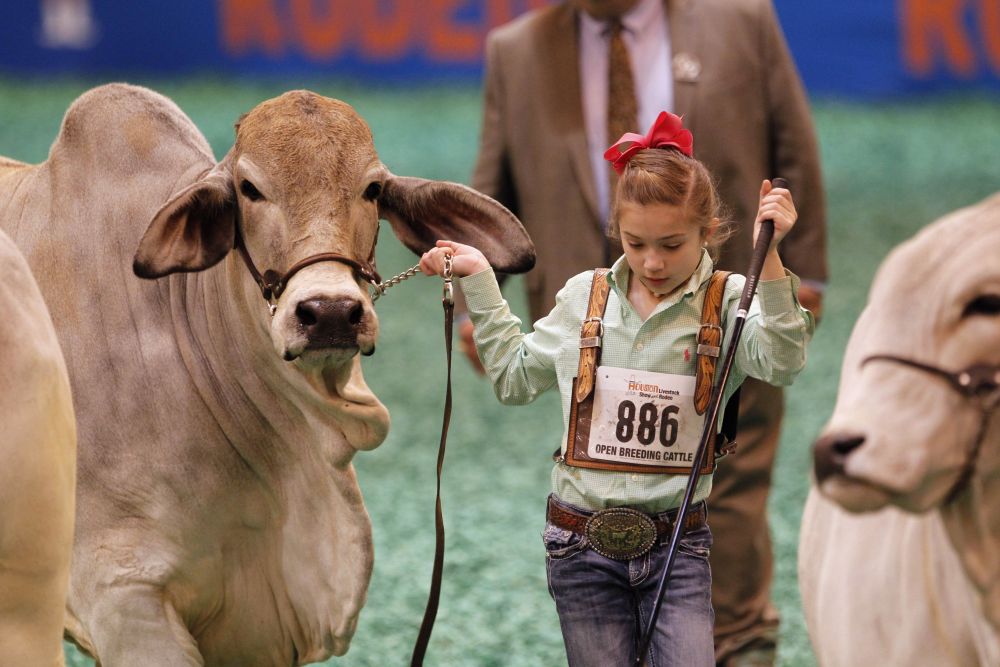 在美国得克萨斯州休斯敦牛仔节现场,一名女孩牵着自家的牛参加肉牛展活动