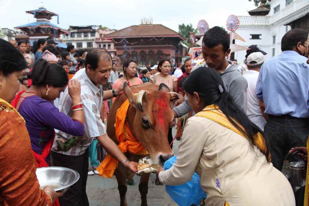 尼泊尔有传统节日神牛节,人们在这一天领着黄牛到大街上参加游行,为逝者祈福,他们相信牛能引领逝者抵达美好的世界。