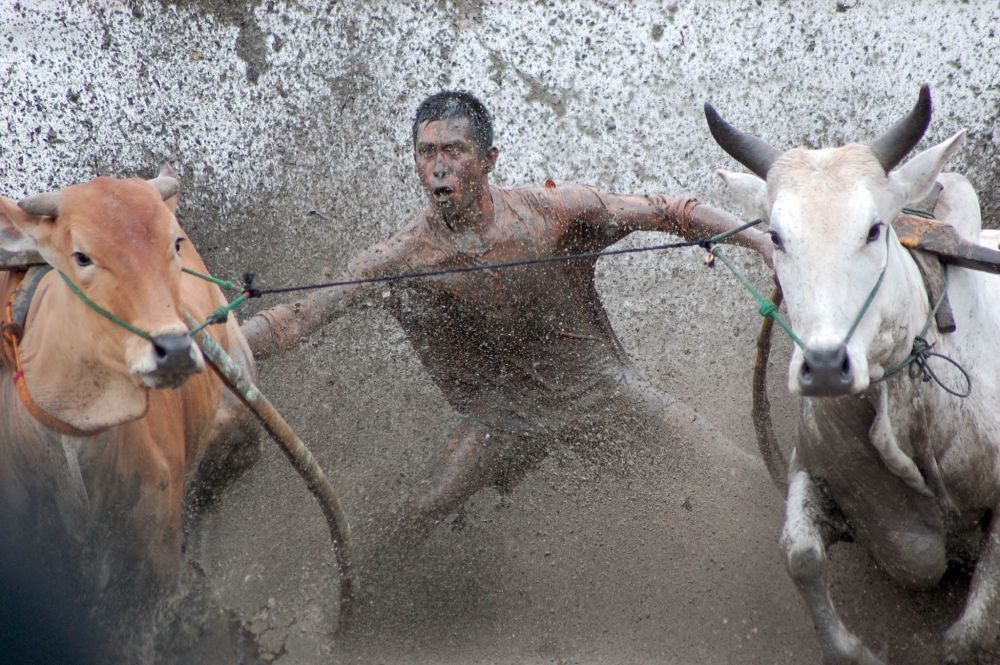 西苏门答腊省的农民在“奔牛”民俗活动中穿越泥泞