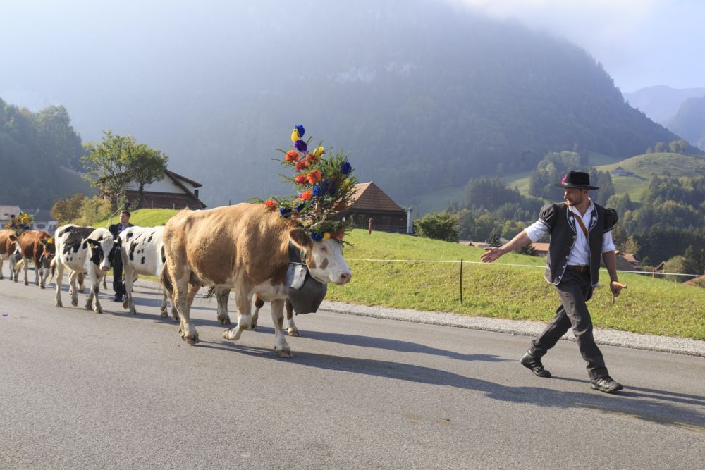 每年的九、十月份,瑞士各地山区牧民都会庆祝“赶牛下山”节。牧民们将大量奶牛从高山草场赶回山下放养,并牵牛在村镇中巡游。