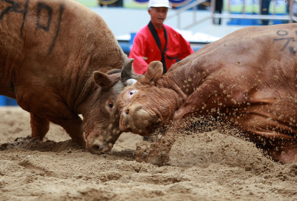 在韩国庆尚北道清道郡,名为“元畅”的牛(右)和名为“居美”的牛在激烈搏斗