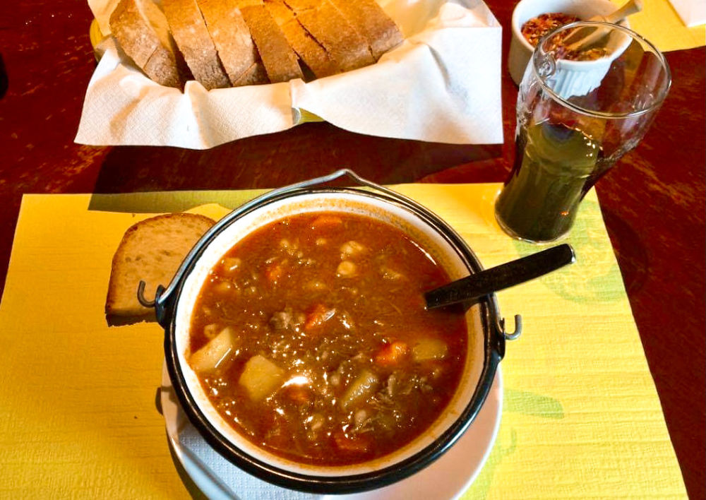 匈牙利国菜“Goulash”土豆牛肉汤味道浓厚,是牛肉块和土豆丁、洋葱、辣椒粉等一起炖成,口味偏咸,要配面包食用。