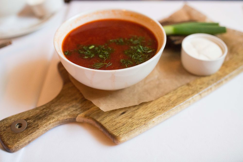 这是在俄罗斯圣彼得堡喀秋莎餐厅拍摄的红菜汤