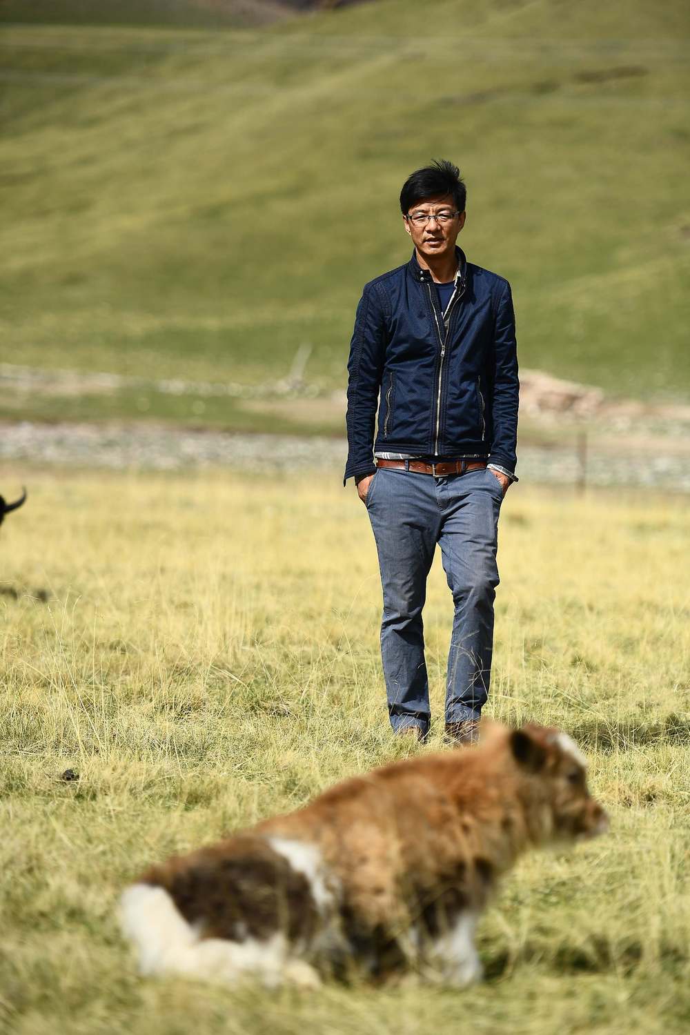 多杰才让和一头小牦牛在一起