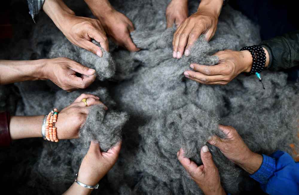 在青海省海北藏族自治州刚察县扶贫产业示范园,多杰才让和员工一起检查分梳好的牦牛绒