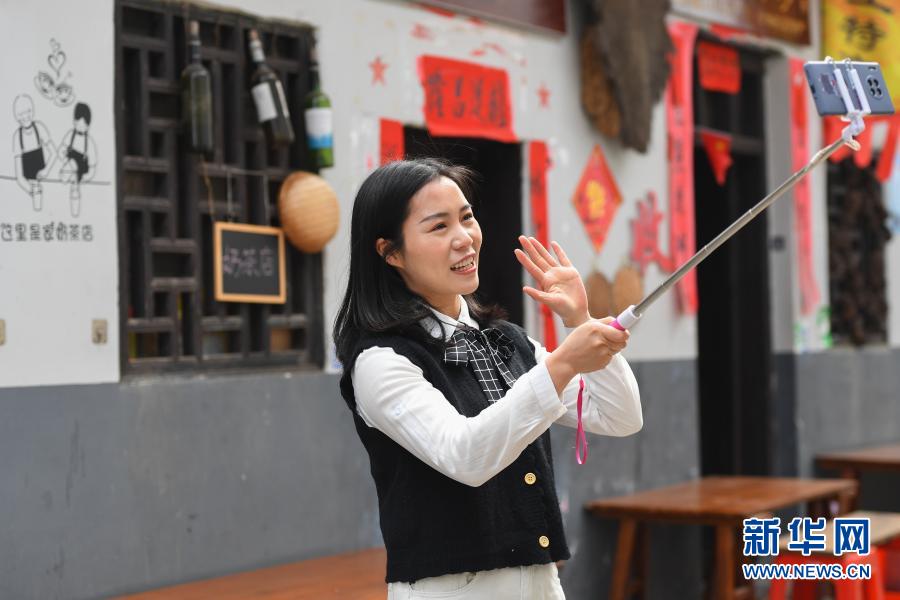 在沙洲瑶族村,朱梦嘉在奶茶店前拍VLOG(1月30日摄)。新华社记者 陈泽国 摄