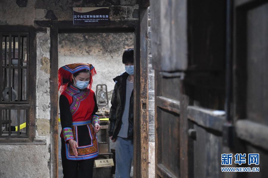 朱梦嘉带着游客参观“半条被子”故事发生地旧址(1月30日摄)。新华社记者 陈泽国 摄