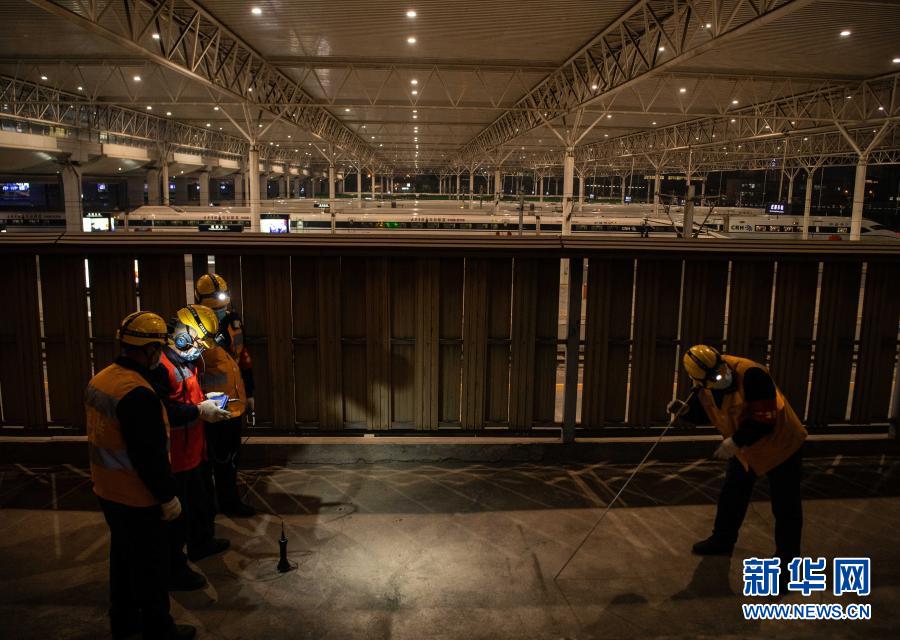 在成都东站,李顺洪(右一)和工友检查站台给水管道(1月24日摄)。新华社记者 王曦 摄