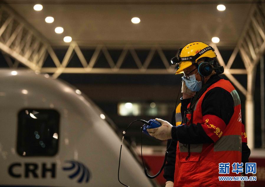 在成都东站,李顺洪(后)出发前检查头灯(1月24日摄)。新华社记者 王曦 摄