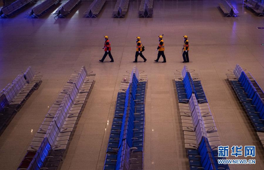 在成都东站,李顺洪(左一)和工友经过候车大厅前往站台进行听漏作业(1月24日摄)。新华社记者 王曦 摄