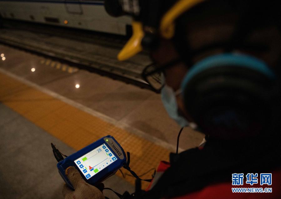 在成都东站,李顺洪查看听漏仪上显示的数据(1月24日摄)。新华社记者 王曦 摄