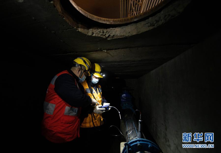 在成都东站,李顺洪(右一)指导工友使用听漏设备检查东站西广场下的给水管道(1月24日摄)。新华社记者 王曦 摄