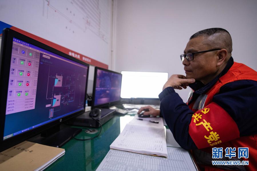 在成都东站,李顺洪在电脑上查看各个水泵的运行情况(1月24日摄)。新华社记者 王曦 摄